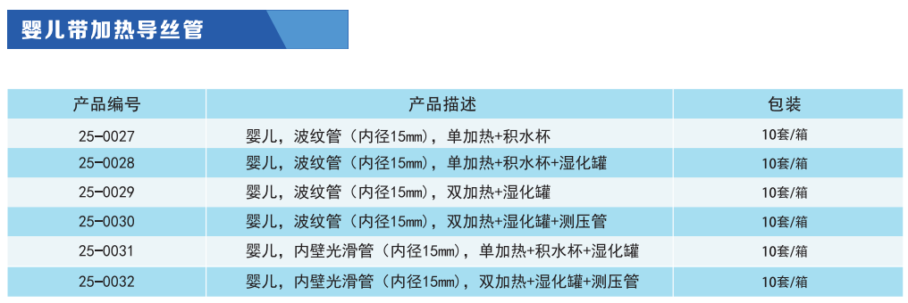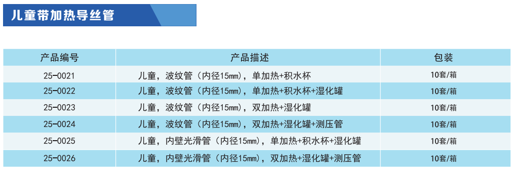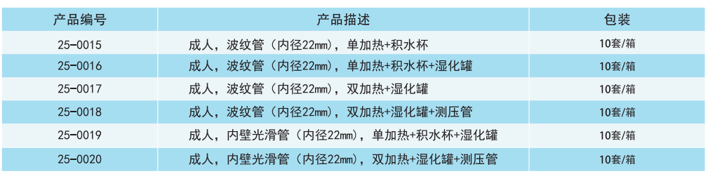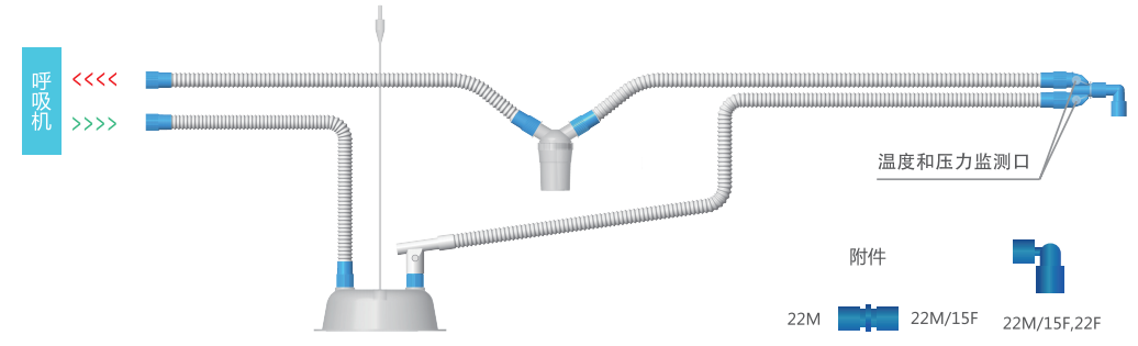 常用于呼吸机、麻醉机与面罩或气管插管之间的气路连接;与呼吸湿化器连接具有加热呼吸管路内气体功能,对因与环境交换失去的热量起补偿作用,保持恒定的气体温度从而减少因气体流动产生的冷凝水。